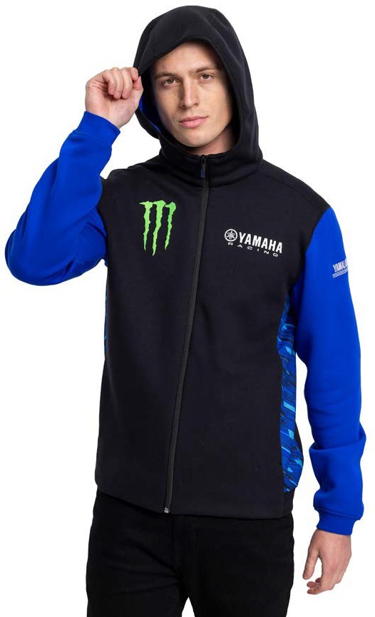 Stylish and comfortable, the Monster Unisex Hoodie in black and blue is perfect for everyday wear. A fulllength zip offers adjustable comfort, with Yamaha Racing and Monster logos capturing a racing feel. Side panel graphics complete this slick design.