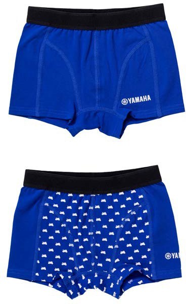 A unique, cool addition to kids’ wardrobes, the Boy’s Underwear is a comfy pair of boxerstyle briefs in stylish Yamaha tones. One pair is classic blue with Yamaha branding, and one pair with a cool motorcycle print in white.